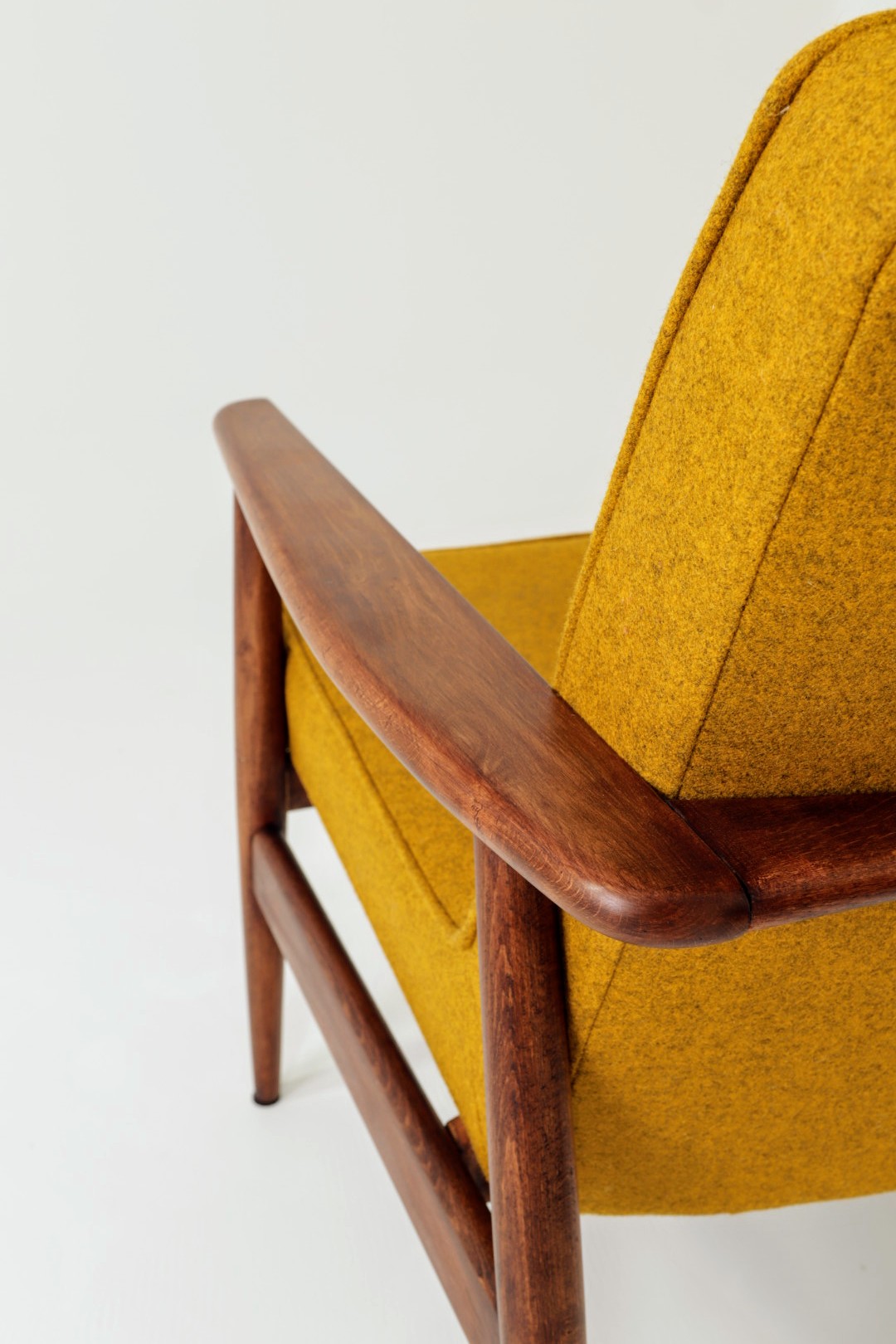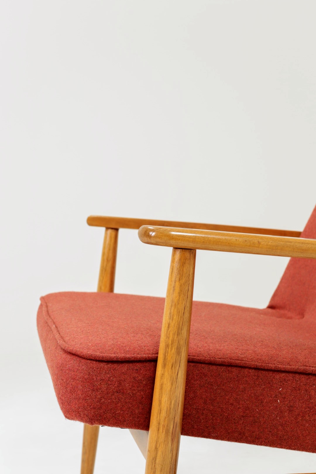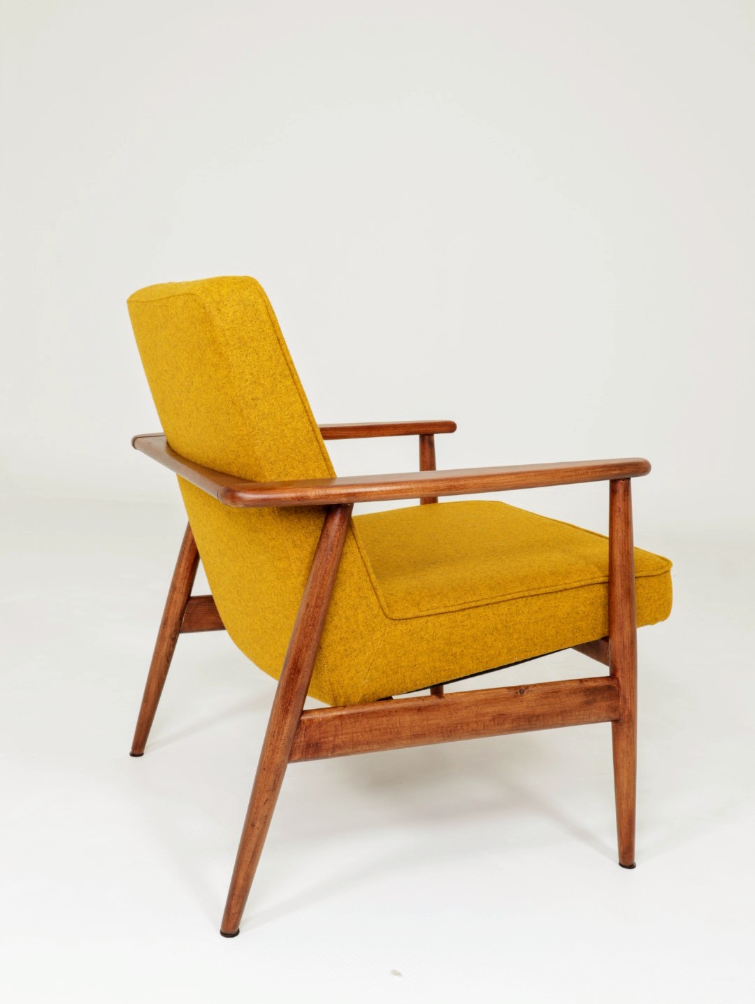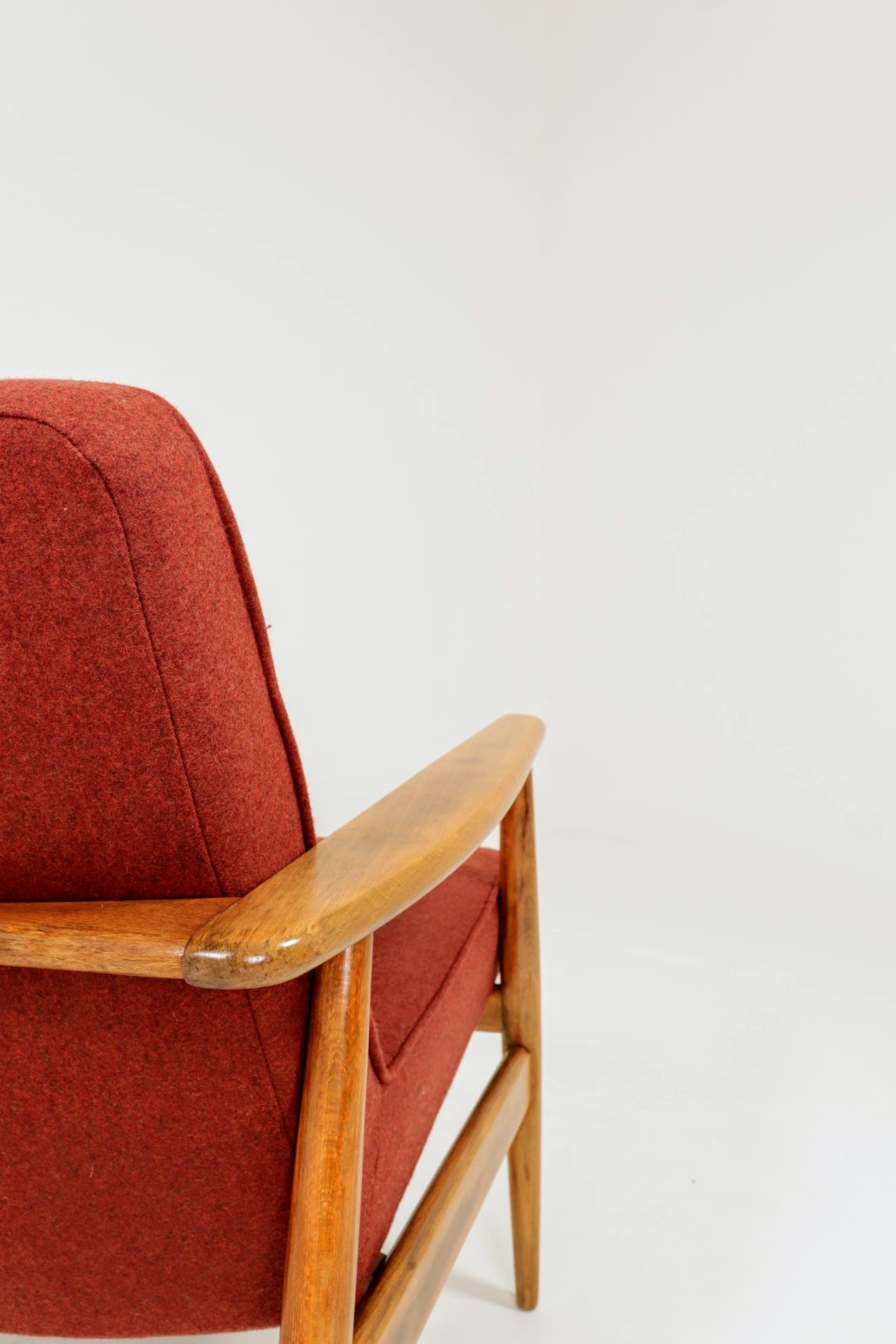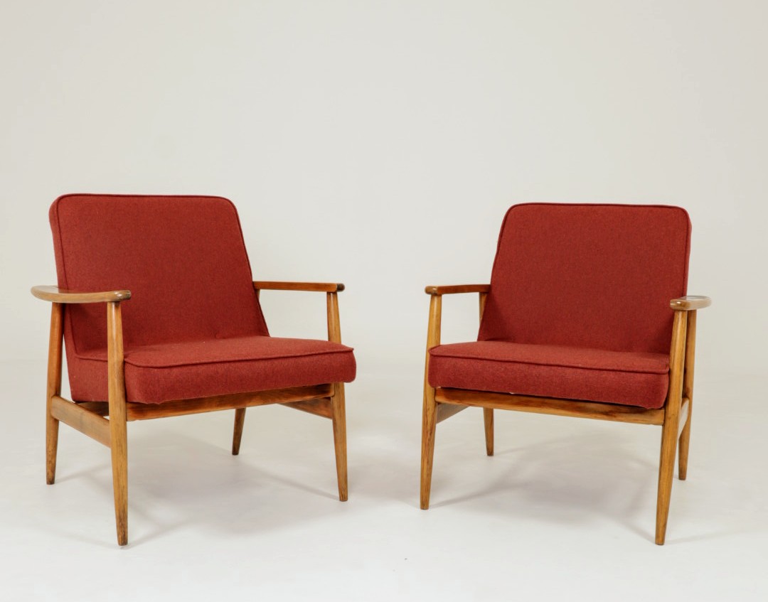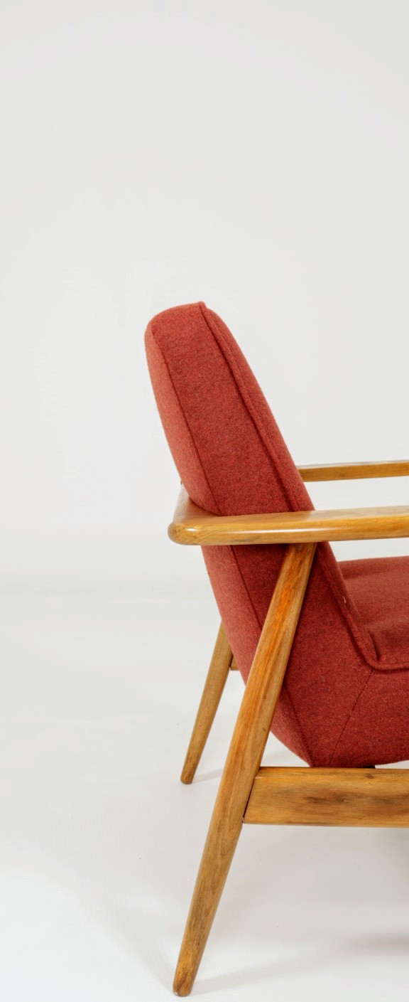 Designed in the early 1960s by Juliusz Kędziorek, this armchair is a celebrated icon of Polish industrial design. Depending on the historical catalog, it is identified as Type 0/300-192 (from the Bystrzyca Furniture Factory) or Type 300-193 / GFM 63 (from the Gościcino Furniture Factory). Its most striking feature is the beautifully sculpted beechwood frame, with characteristic armrests that elegantly wrap around the backrest. Despite its compact and slender silhouette, it offers exceptional comfort, making it a perfect fit for both cozy apartments and sophisticated lounge areas.
